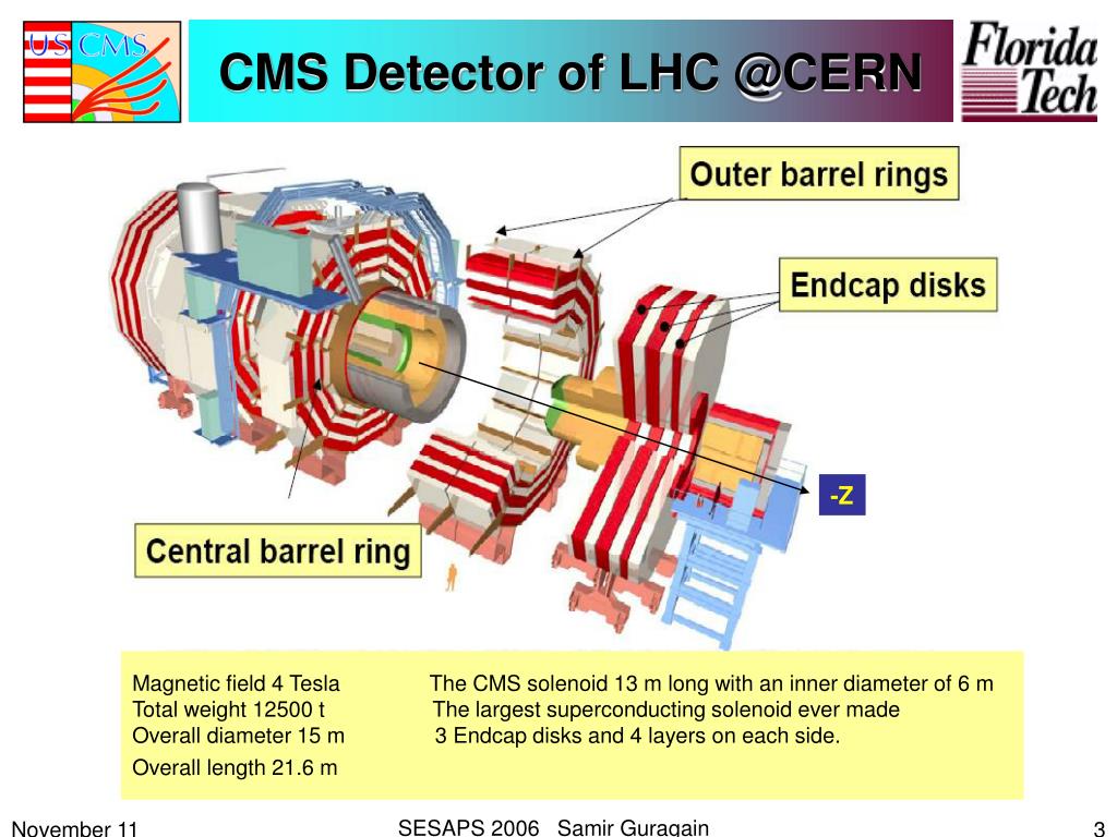 CMS Detector of LHC @CERN -Z Magnetic field 4 Tesla The CMS solenoid 13 m long with an inner diameter of 6 m Total weight 12500 t The largest superconducting solenoid ever made Overall diameter 15 m 3 Endcap disks and 4 layers on each side. Overall length 21.6 m SESAPS 2006 Samir Guragain