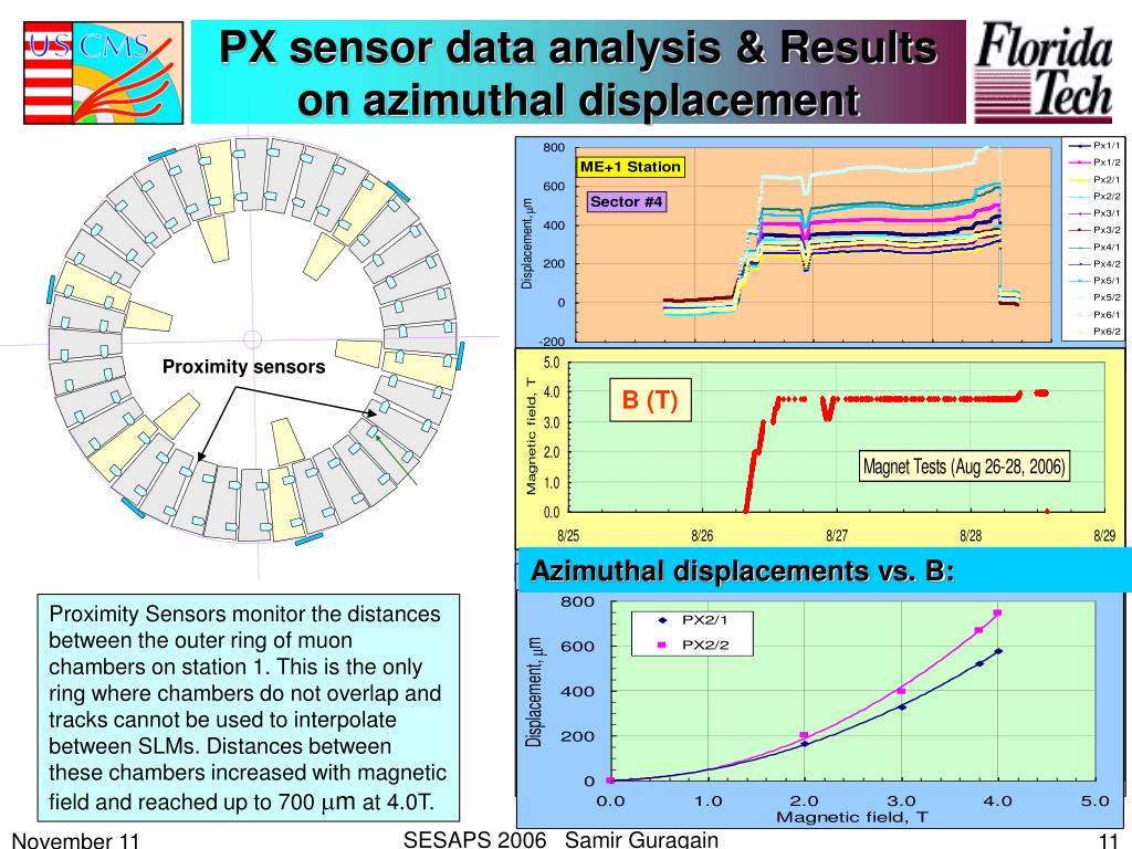 B (T) PX sensor data analysis & Results on azimuthal displacement Proximity sensors Azimuthal displacements vs. B: Proximity Sensors monitor the distances between the outer ring of muon chambers on station 1. This is the only ring where chambers do not overlap and tracks cannot be used to interpolate between SLMs. Distances between these chambers increased with magnetic field and reached up to 700 mm at 4.0T. SESAPS 2006 Samir Guragain
