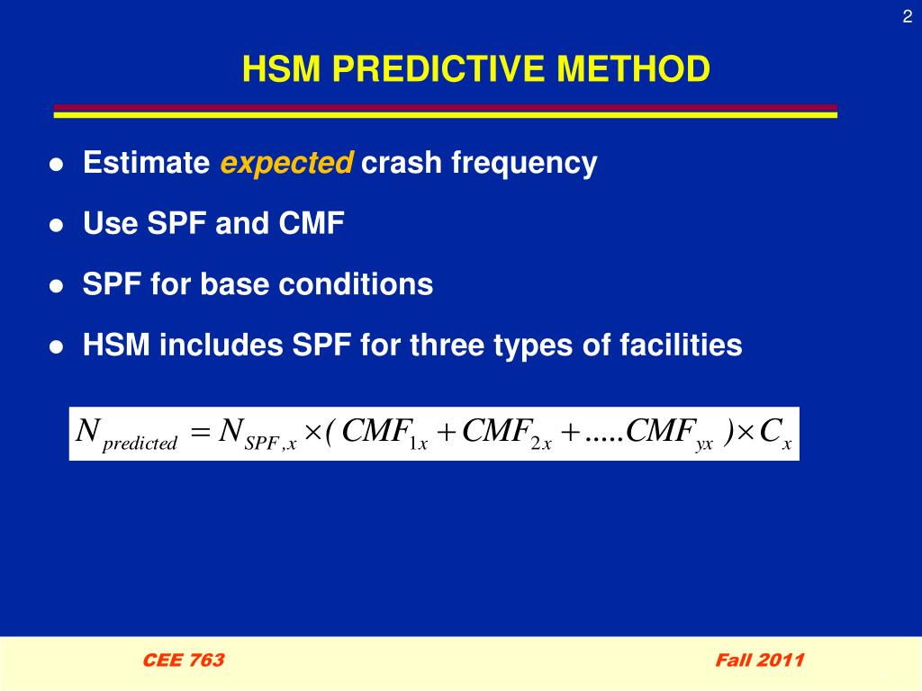 Topic 4 – Predictive Method HSM Volume 2 CEE 763. HSM PREDICTIVE METHOD. Estimate expected crash frequency Use SPF and CMF SPF for base conditions HSM includes SPF for three types of facilities. SPF for Urban/Suburban Arterial Intersections. Intersection type: 3ST, 4ST, 3SG, 4SG