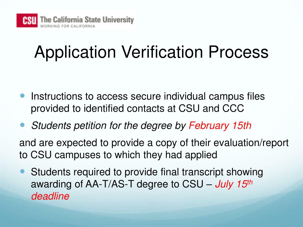 Application Verification Process • Instructions to access secure individual campus files provided to identified contacts at CSU and CCC • Students petition for the degree by February 15th and are expected to provide a copy of their evaluation/report to CSU campuses to which they had applied • Students required to provide final transcript showing awarding of AA-T/AS-T degree to CSU – July 15th deadline