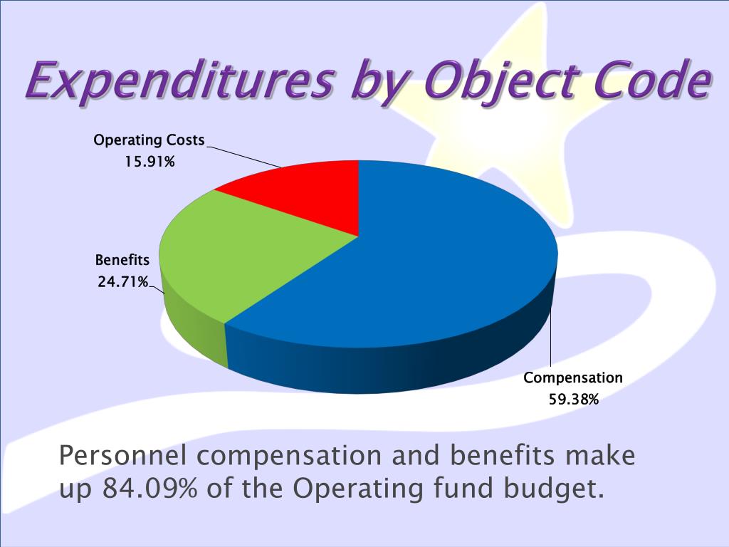 Expenditures by Object Code Personnel compensation and benefits make up 84.09% of the Operating fund budget.