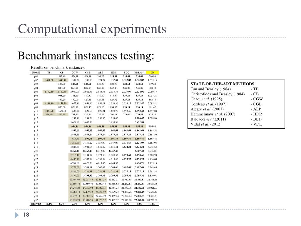 Computational experiments Benchmark instancestesting: Resultson benchmark instances. STATE-OF-THE-ART METHODS TanandBeasley (1984) - TB ChristofidesandBeasley (1984) - CB Chaoet al. (1995) - CGW Cordeau et al. (1997) - CGL Alegre et al. (2007) - ALP Hemmelmayret al. (2007) - HDR Baldacciet al.(2011) - BLD Vidal et al. (2012) - VDL