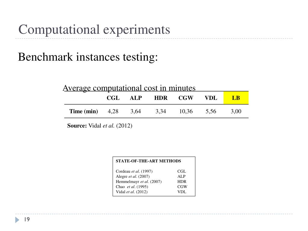 Computational experiments Benchmark instancestesting: Averagecomputationalcost in minutes Source: Vidal et al. (2012) STATE-OF-THE-ART METHODS Cordeauet al. (1997) CGL Alegre et al. (2007) ALP Hemmelmayret al. (2007) HDR Chaoet al. (1995) CGW Vidal et al. (2012) VDL