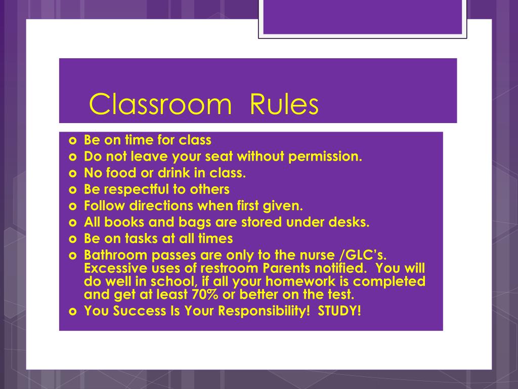 Classroom Rules • Be on time for class • Do not leave your seat without permission. • No food or drink in class. • Be respectful to others • Follow directions when first given. • All books and bags are stored under desks. • Be on tasks at all times • Bathroom passes are only to the nurse /GLC’s. Excessive uses of restroom Parents notified. You will do well in school, if all your homework is completed and get at least 70% or better on the test. • You Success Is Your Responsibility! STUDY!