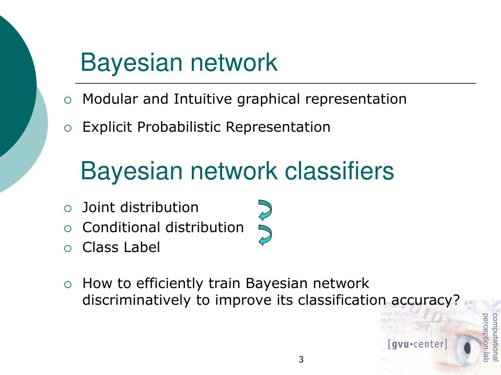 Bayesian network • Modular and Intuitive graphical representation • Explicit Probabilistic Representation Bayesian network classifiers • Joint distribution • Conditional distribution • Class Label • How to efficiently train Bayesian network discriminatively to improve its classification accuracy?