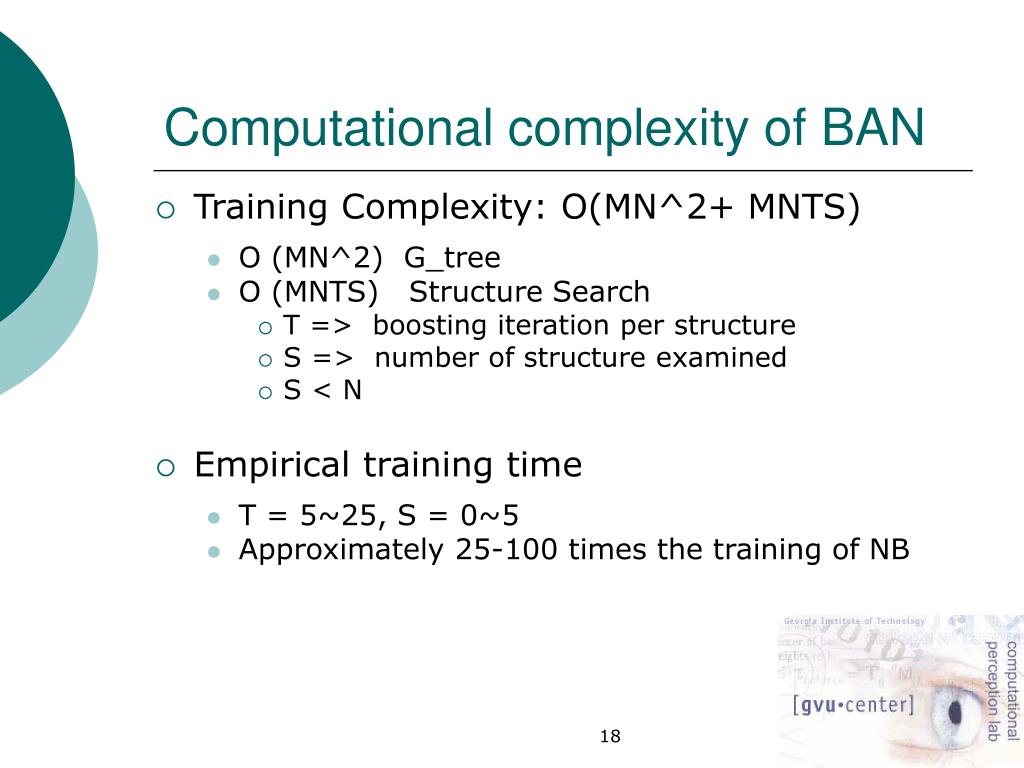Computational complexity of BAN • Training Complexity: O(MN^2+ MNTS) • O (MN^2) G_tree • O (MNTS) Structure Search • T => boosting iteration per structure • S => number of structure examined • S < N • Empirical training time • T = 5~25, S = 0~5 • Approximately 25-100 times the training of NB