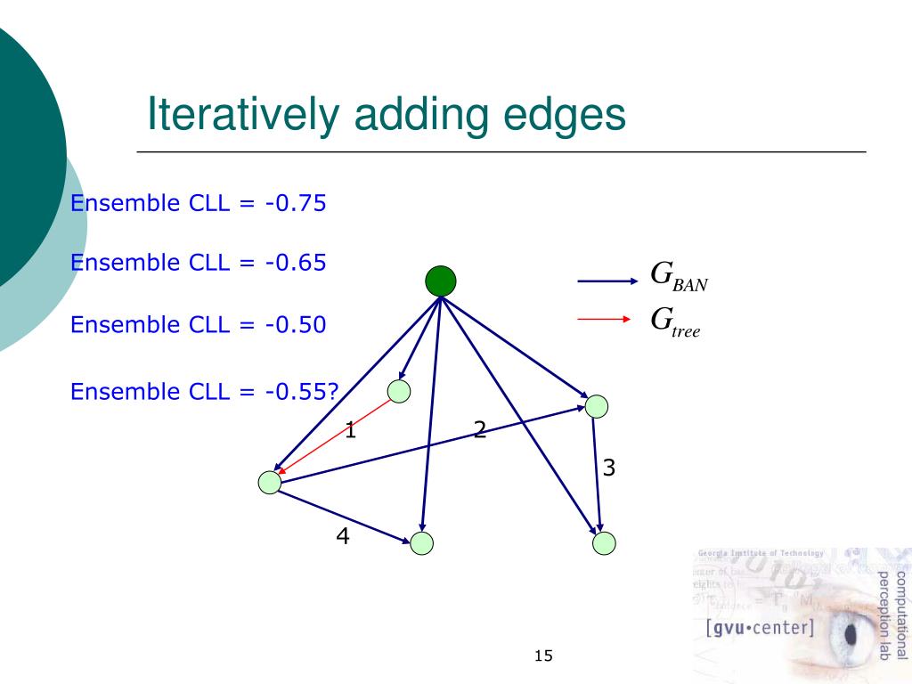 Ensemble CLL = -0.65 Ensemble CLL = -0.50 Ensemble CLL = -0.55? Iteratively adding edges Ensemble CLL = -0.75 1 2 3 4