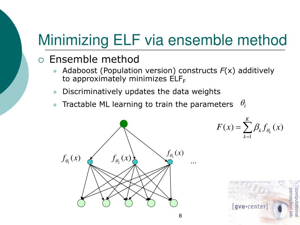 … Minimizing ELF via ensemble method • Ensemble method • Adaboost (Population version) constructs F(x) additively to approximately minimizes ELFF • Discriminatively updates the data weights • Tractable ML learning to train the parameters