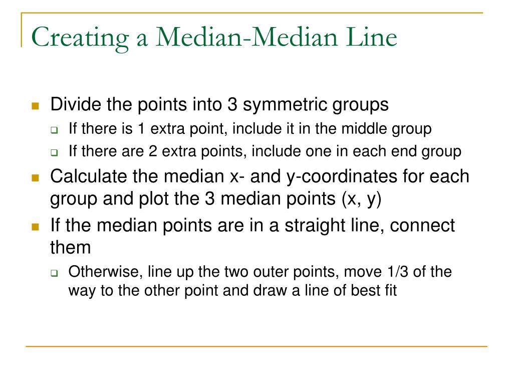 Creating a Median-Median Line • Divide the points into 3 symmetric groups • If there is 1 extra point, include it in the middle group • If there are 2 extra points, include one in each end group • Calculate the median x- and y-coordinates for each group and plot the 3 median points (x, y) • If the median points are in a straight line, connect them • Otherwise, line up the two outer points, move 1/3 of the way to the other point and draw a line of best fit