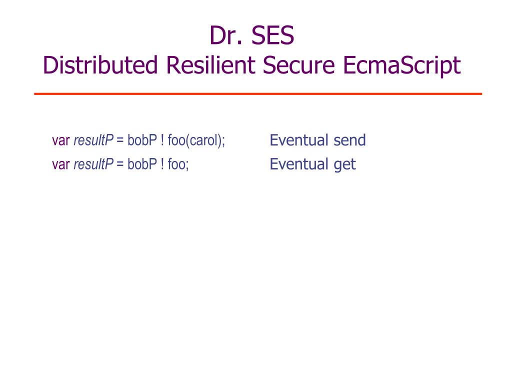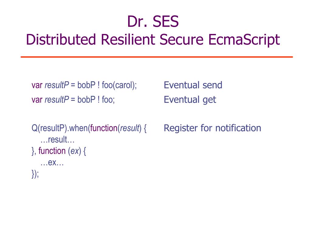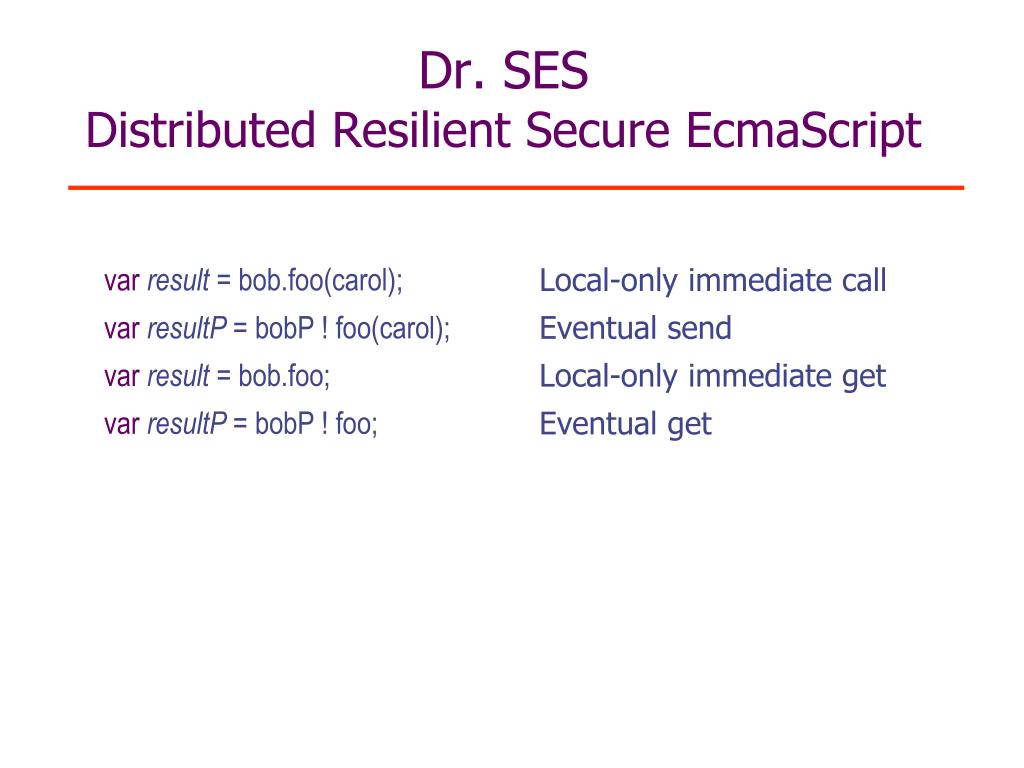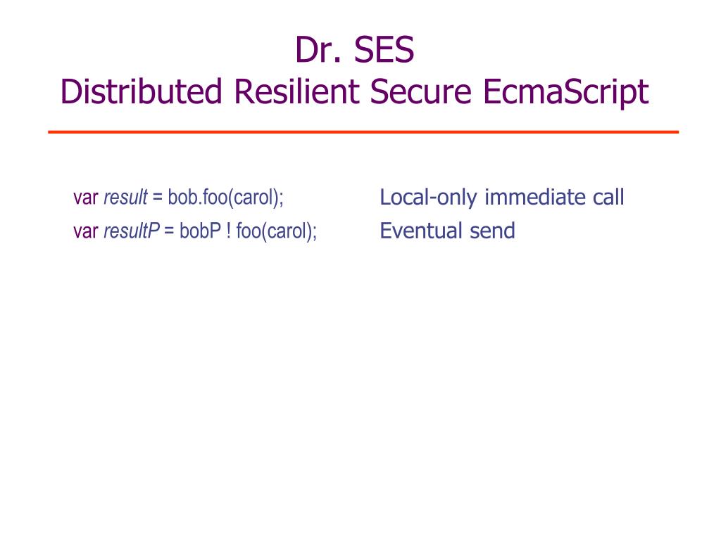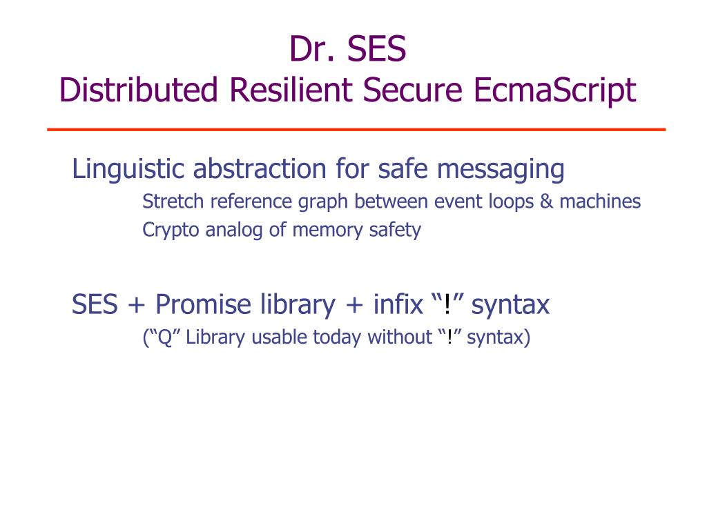 Dr. SESDistributed Resilient Secure EcmaScript • Linguistic abstraction for safe messaging • Stretch reference graph between event loops & machines • Crypto analog of memory safety • SES + Promise library + infix “!” syntax • (“Q” Library usable today without “!” syntax)