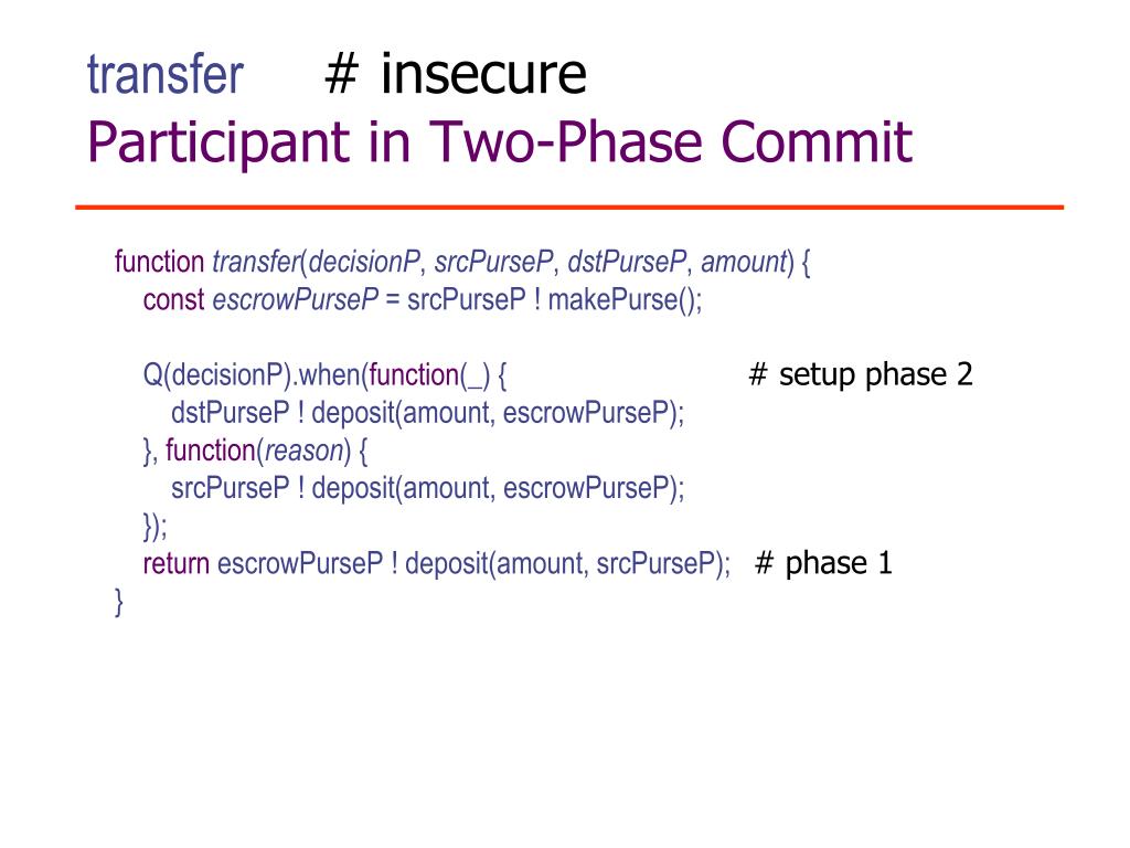 transfer # insecureParticipant in Two-Phase Commit function transfer(decisionP, srcPurseP, dstPurseP, amount) { const escrowPurseP = srcPurseP ! makePurse(); Q(decisionP).when(function(_) { # setup phase 2 dstPurseP ! deposit(amount, escrowPurseP); }, function(reason){ srcPurseP ! deposit(amount, escrowPurseP); }); return escrowPurseP ! deposit(amount, srcPurseP); # phase 1 }