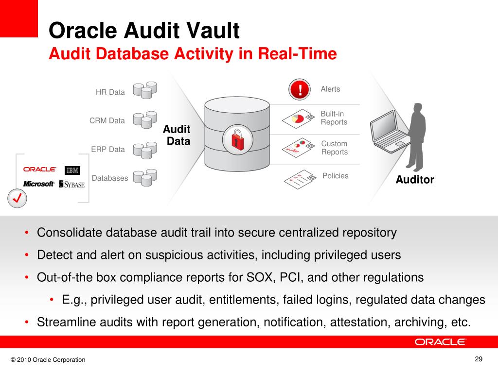 Policies HR Data ! Alerts CRM Data Built-in Reports ERP Data Custom Reports Databases Oracle Audit VaultAudit Database Activity in Real-Time Audit Data Auditor • Consolidate database audit trail into secure centralized repository • Detect and alert on suspicious activities, including privileged users • Out-of-the box compliance reports for SOX, PCI, and other regulations • E.g., privileged user audit, entitlements, failed logins, regulated data changes • Streamline audits with report generation, notification, attestation, archiving, etc.
