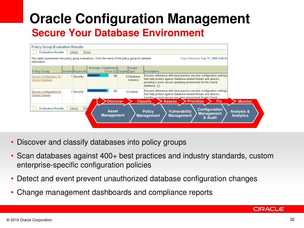 Oracle Configuration ManagementSecure Your Database Environment Monitor Discover Classify Assess Prioritize Fix Monitor ConfigurationManagement & Audit AssetManagement PolicyManagement Vulnerability Management Analysis & Analytics • Discover and classify databases into policy groups • Scan databases against 400+ best practices and industry standards, custom enterprise-specific configuration policies • Detect and event prevent unauthorized database configuration changes • Change management dashboards and compliance reports