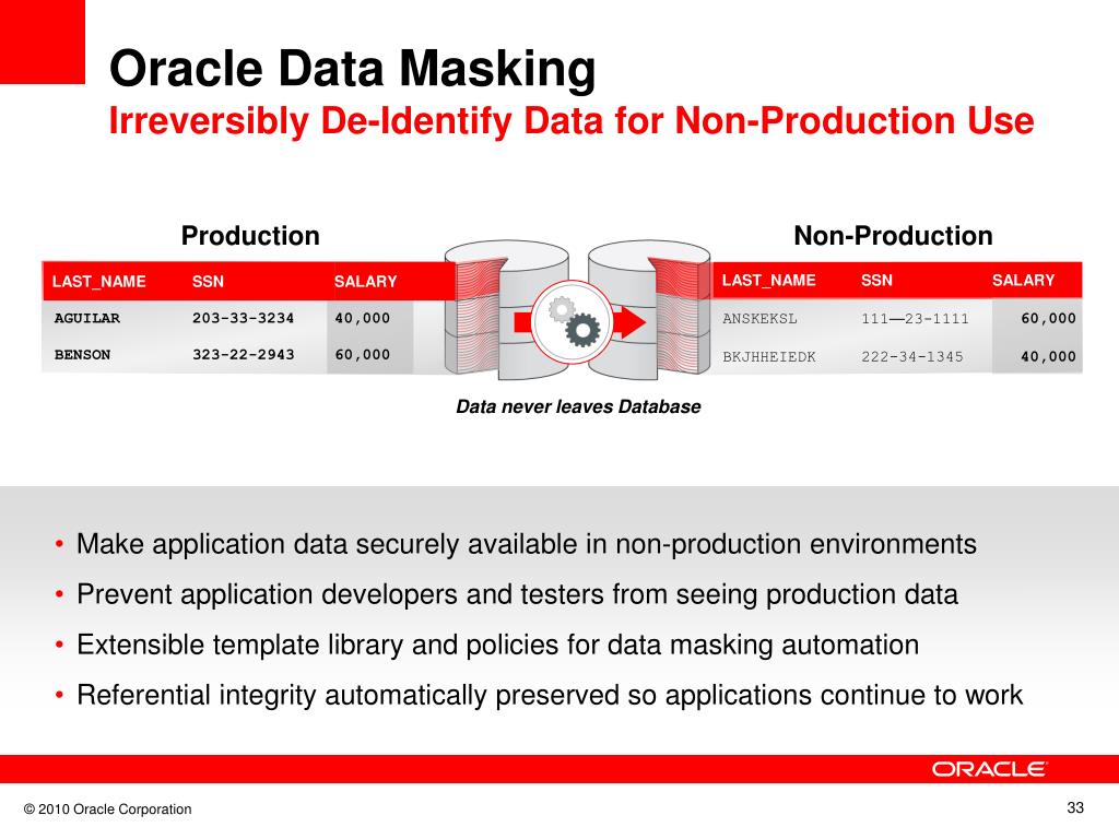Oracle Data MaskingIrreversibly De-Identify Data for Non-Production Use Production Non-Production Data never leaves Database • Make application data securely available in non-production environments • Prevent application developers and testers from seeing production data • Extensible template library and policies for data masking automation • Referential integrity automatically preserved so applications continue to work
