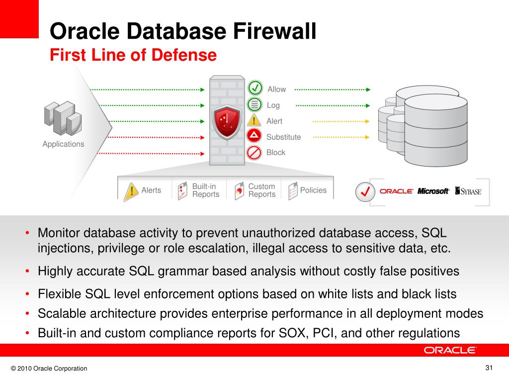 Oracle Database FirewallFirst Line of Defense Allow Log Alert Substitute Applications Block Built-in Reports Custom Reports Alerts Policies • Monitor database activity to prevent unauthorized database access, SQL injections, privilege or role escalation, illegal access to sensitive data, etc. • Highly accurate SQL grammar based analysis without costly false positives • Flexible SQL level enforcement options based on white lists and black lists • Scalable architecture provides enterprise performance in all deployment modes • Built-in and custom compliance reports for SOX, PCI, and other regulations
