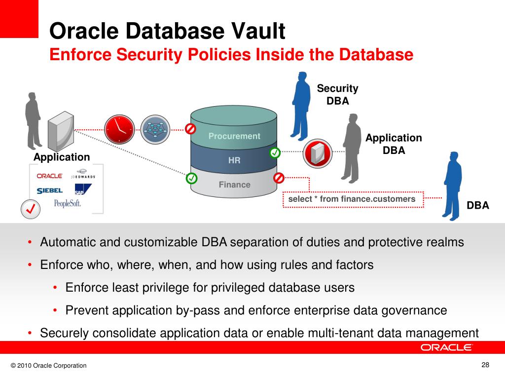 Oracle Database VaultEnforce Security Policies Inside the Database SecurityDBA Application DBA Procurement Application HR Finance select * from finance.customers DBA • Automatic and customizable DBA separation of duties and protective realms • Enforce who, where, when, and how using rules and factors • Enforce least privilege for privileged database users • Prevent application by-pass and enforce enterprise data governance • Securely consolidate application data or enable multi-tenant data management