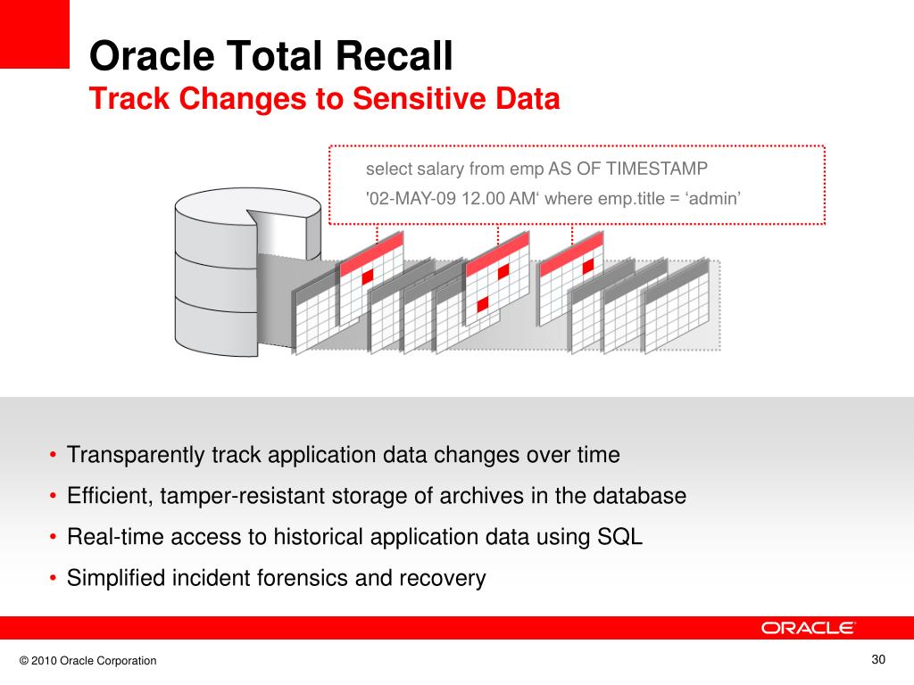 Oracle Total RecallTrack Changes to Sensitive Data select salary from emp AS OF TIMESTAMP '02-MAY-09 12.00 AM‘ where emp.title = ‘admin’ • Transparently track application data changes over time • Efficient, tamper-resistant storage of archives in the database • Real-time access to historical application data using SQL • Simplified incident forensics and recovery