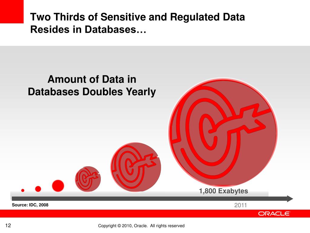 Amount of Data in Databases Doubles Yearly Two Thirds of Sensitive and Regulated Data Resides in Databases… 1,800 Exabytes 2011 Source: IDC, 2008