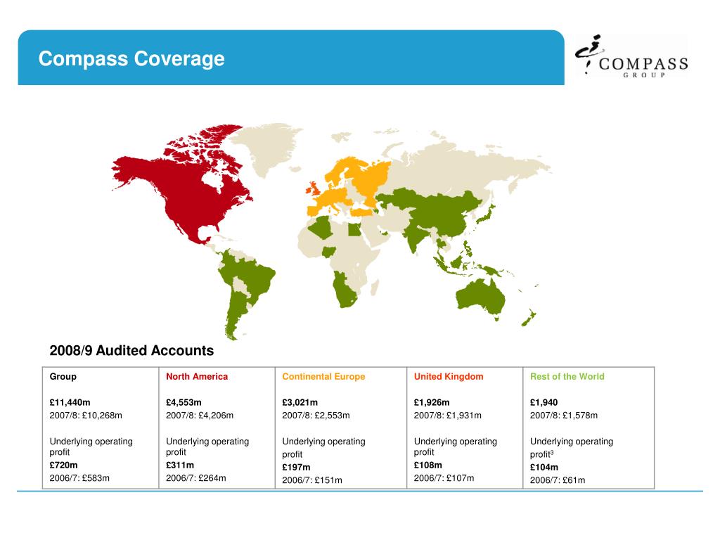 Compass Group PLC Revenue >£14 bn (FY 2010) Over 40,000 client locations Portfolio of market leading sector brands 386,000 employees globally 90 of fortune 100 companies are our clients 4 billion meals a year served Global reach in more than 50 countries Position 35th in the FTSE 100 Index £5.6m Worldwide charitable donations 2009 A world leading food services and support services company