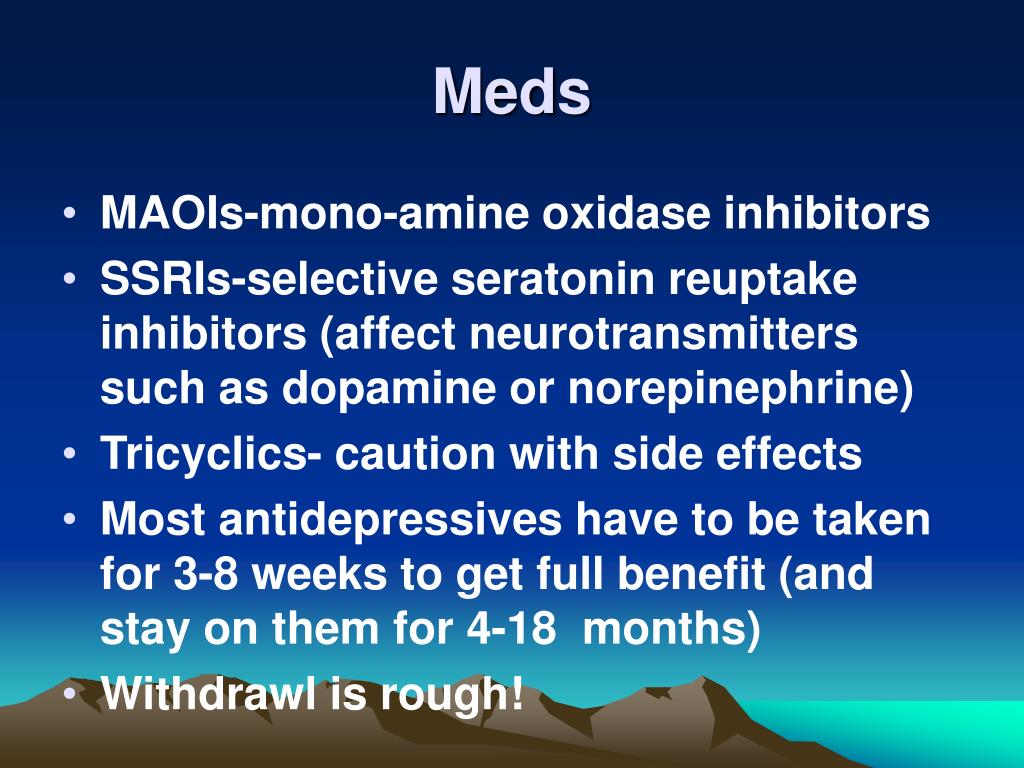 Meds • MAOIs-mono-amine oxidase inhibitors • SSRIs-selective seratonin reuptake inhibitors (affect neurotransmitters such as dopamine or norepinephrine) • Tricyclics- caution with side effects • Most antidepressives have to be taken for 3-8 weeks to get full benefit (and stay on them for 4-18 months) • Withdrawl is rough!