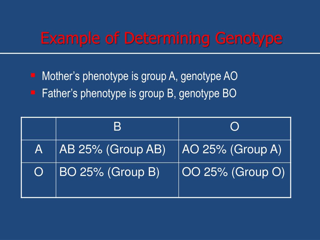 Example of Determining Genotype • Mother’s phenotype is group A, genotype AO • Father’s phenotype is group B, genotype BO