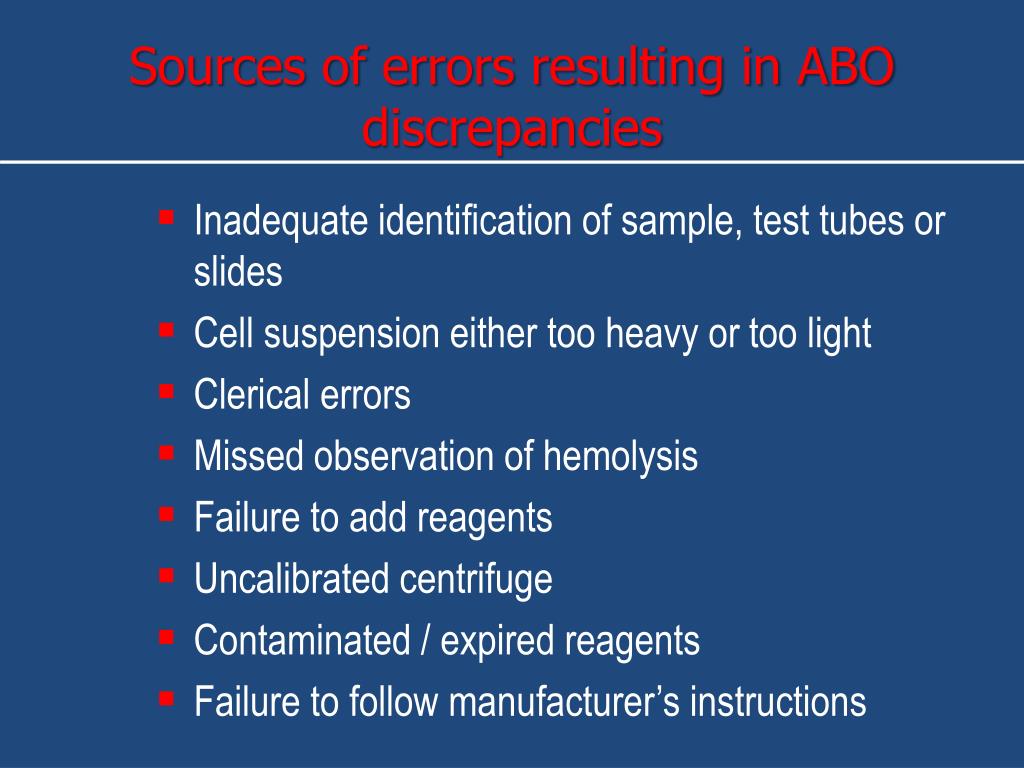 Sources of errors resulting in ABO discrepancies • Inadequate identification of sample, test tubes or slides • Cell suspension either too heavy or too light • Clerical errors • Missed observation of hemolysis • Failure to add reagents • Uncalibrated centrifuge • Contaminated / expired reagents • Failure to follow manufacturer’s instructions