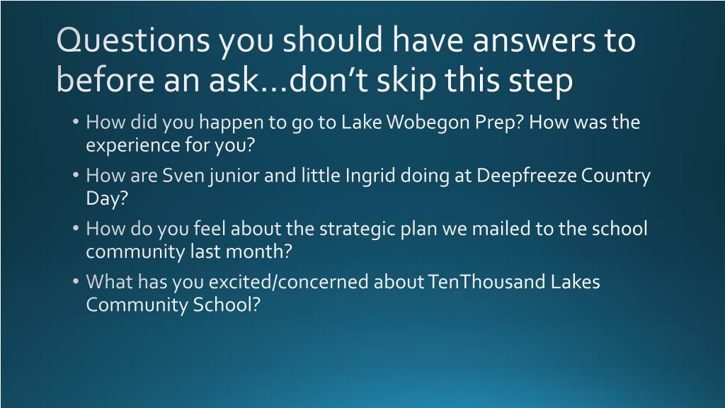 Questions you should have answers to before an ask…don’t skip this step • How did you happen to go to Lake Wobegon Prep? How was the experience for you? • How are Sven junior and little Ingrid doing at Deepfreeze Country Day? • How do you feel about the strategic plan we mailed to the school community last month? • What has you excited/concerned about TenThousand Lakes Community School?