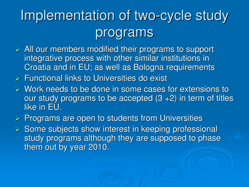 Implementation of two-cycle study programs • All our members modified their programs to support integrative process with other similar institutions in Croatia and in EU; as well as Bologna requirements • Functional links to Universities do exist • Work needs to be done in some cases for extensions to our study programs to be accepted (3 +2) in term of titles like in EU. • Programs are open to students from Universities • Some subjects show interest in keeping professional study programs although they are supposed to phase them out by year 2010.