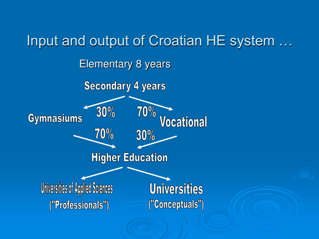 Input and output of Croatian HE system … Elementary 8 years Secondary 4 years 70% 30% Gymnasiums Vocational 70% 30% Higher Education Universities of Applied Sciences Universities ("Conceptuals") ("Professionals")