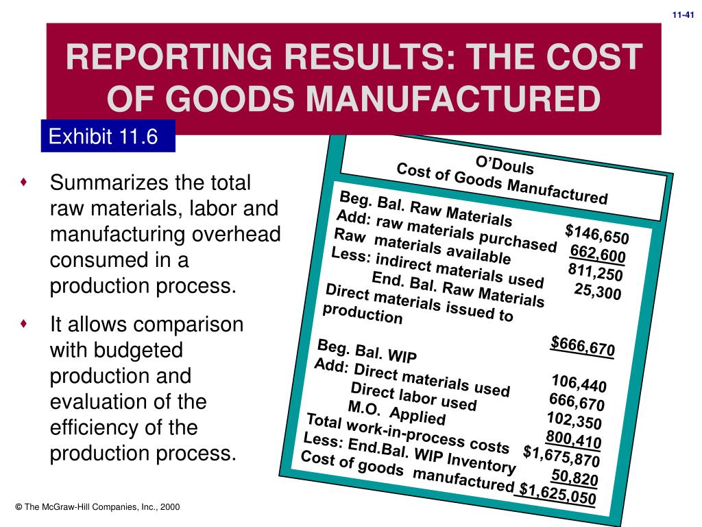 REPORTING RESULTS: THE COST OF GOODS MANUFACTURED Exhibit 11.6 O’Douls Cost of Goods Manufactured • Summarizes the total raw materials, labor and manufacturing overhead consumed in a production process. • It allows comparison with budgeted production and evaluation of the efficiency of the production process. Beg. Bal. Raw Materials $146,650 Add: raw materials purchased 662,600 Raw materials available 811,250 Less: indirect materials used 25,300 End. Bal. Raw Materials Direct materials issued to production $666,670 Beg. Bal. WIP 106,440 Add: Direct materials used 666,670 Direct labor used 102,350 M.O. Applied 800,410 Total work-in-process costs $1,675,870 Less: End.Bal. WIP Inventory 50,820 Cost of goods manufactured $1,625,050