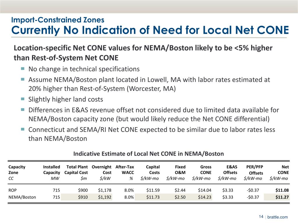 Import-Constrained ZonesCurrently No Indication of Need for Local Net CONE • Location-specific Net CONE values for NEMA/Boston likely to be <5% higher than Rest-of-System Net CONE • No change in technical specifications • Assume NEMA/Boston plant located in Lowell, MA with labor rates estimated at 20% higher than Rest-of-System (Worcester, MA) • Slightly higher land costs • Differences in E&AS revenue offset not considered due to limited data available for NEMA/Boston capacity zone (but would likely reduce the Net CONE differential) • Connecticut and SEMA/RI Net CONE expected to be similar due to labor rates less than NEMA/Boston Indicative Estimate of Local Net CONE in NEMA/Boston