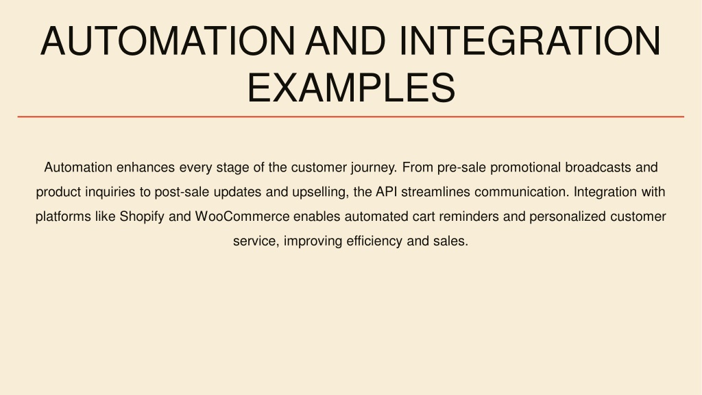 7. AUTOMATION AND INTEGRATION EXAMPLES Automation enhances every stage of the customer journey. From pre-sale promotional broadcasts and product inquiries to post-sale updates and upselling, the API streamlines communication. Integration with platforms like Shopify and WooCommerce enables automated cart reminders and personalized customer service, improving efficiency and sales.