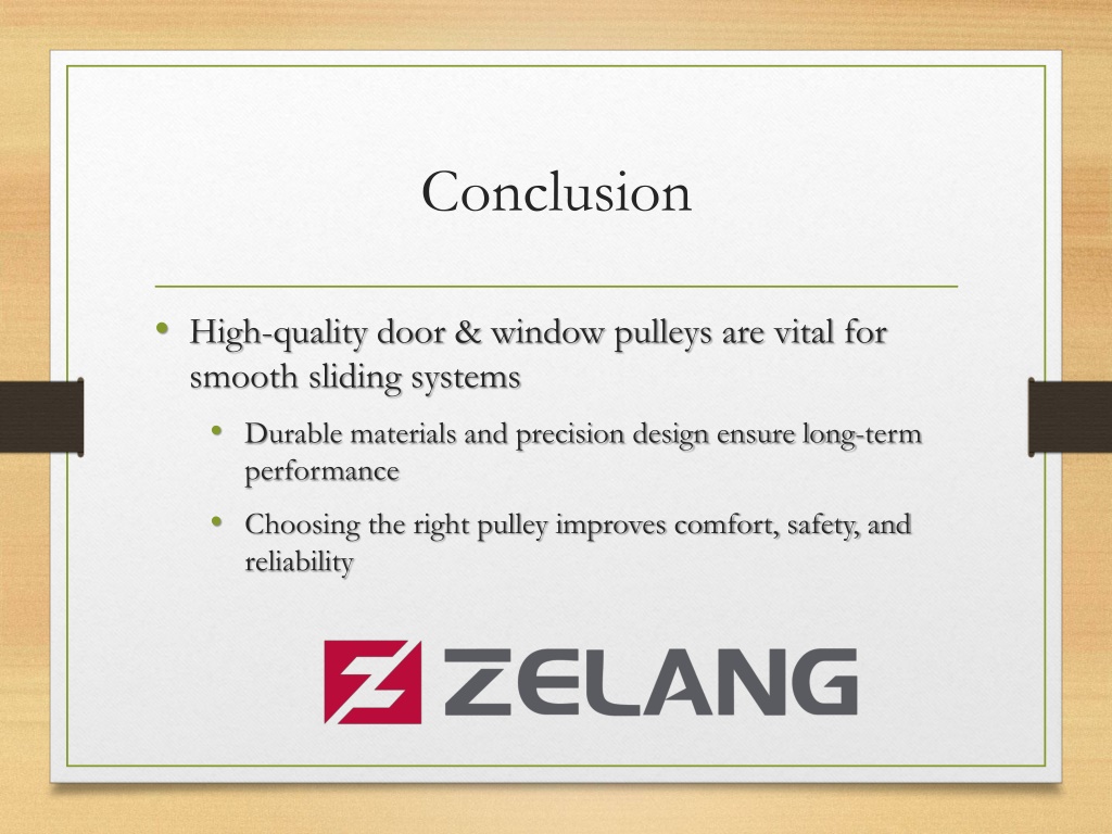 10. Conclusion • High-quality door & window pulleys are vital for smooth sliding systems • Durable materials and precision design ensure long-term performance • Choosing the right pulley improves comfort, safety, and reliability