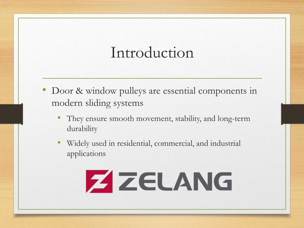 2. Introduction • Door & window pulleys are essential components in modern sliding systems • They ensure smooth movement, stability, and long-term durability • Widely used in residential, commercial, and industrial applications