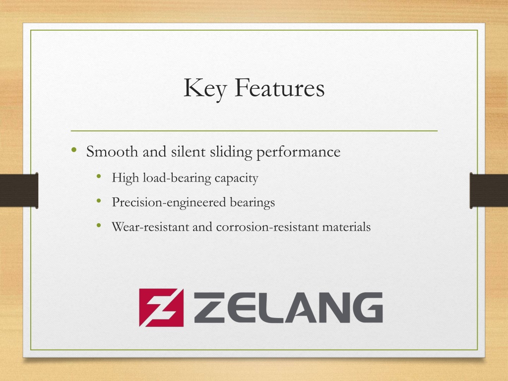 4. Key Features • Smooth and silent sliding performance • High load-bearing capacity • Precision-engineered bearings • Wear-resistant and corrosion-resistant materials