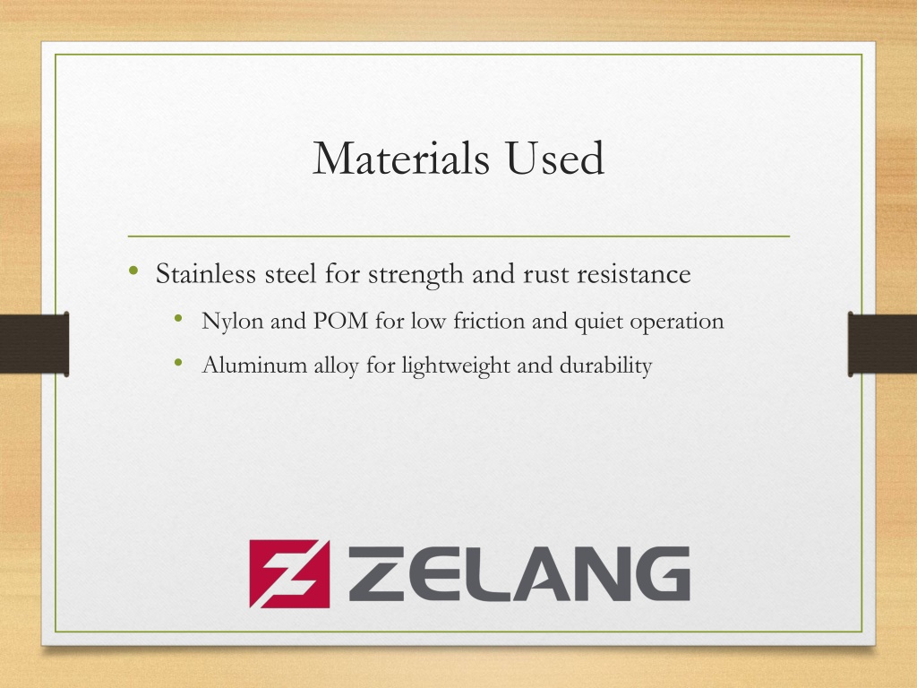 5. Materials Used • Stainless steel for strength and rust resistance • Nylon and POM for low friction and quiet operation • Aluminum alloy for lightweight and durability