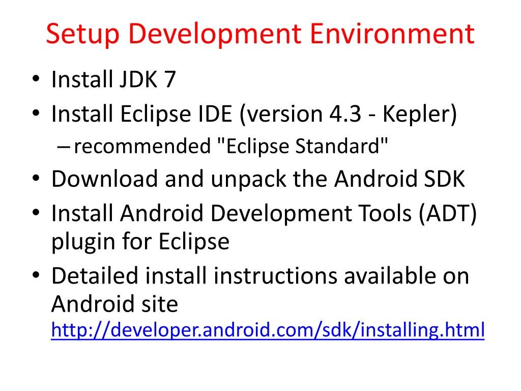 Setup Development Environment • Install JDK 7 • Install Eclipse IDE (version 4.3 - Kepler) • recommended "Eclipse Standard" • Download and unpack the Android SDK • Install Android Development Tools (ADT) plugin for Eclipse • Detailed install instructions available on Android sitehttp://developer.android.com/sdk/installing.html