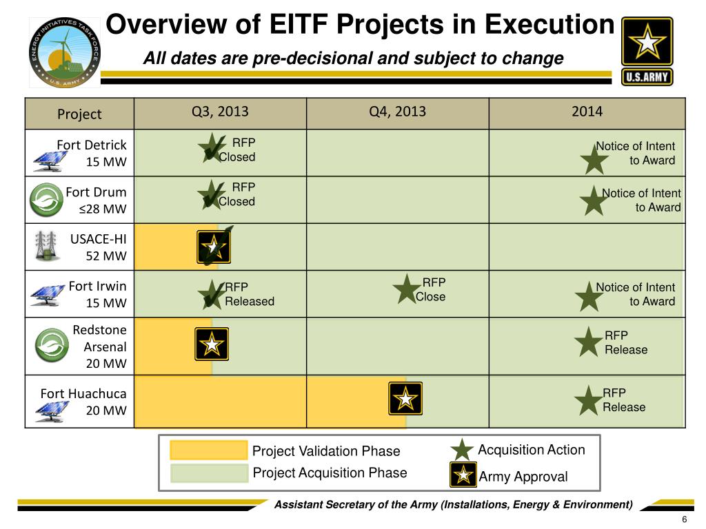 Department of Defense Renewable Energy Projects Update Alan King Director, Project Execution Directorate 13 June 2013. Army EITF Update . Discussion Topics Army’s renewable energy mandates and challenges Army’s Energy Initiatives Task Force (EITF) Update