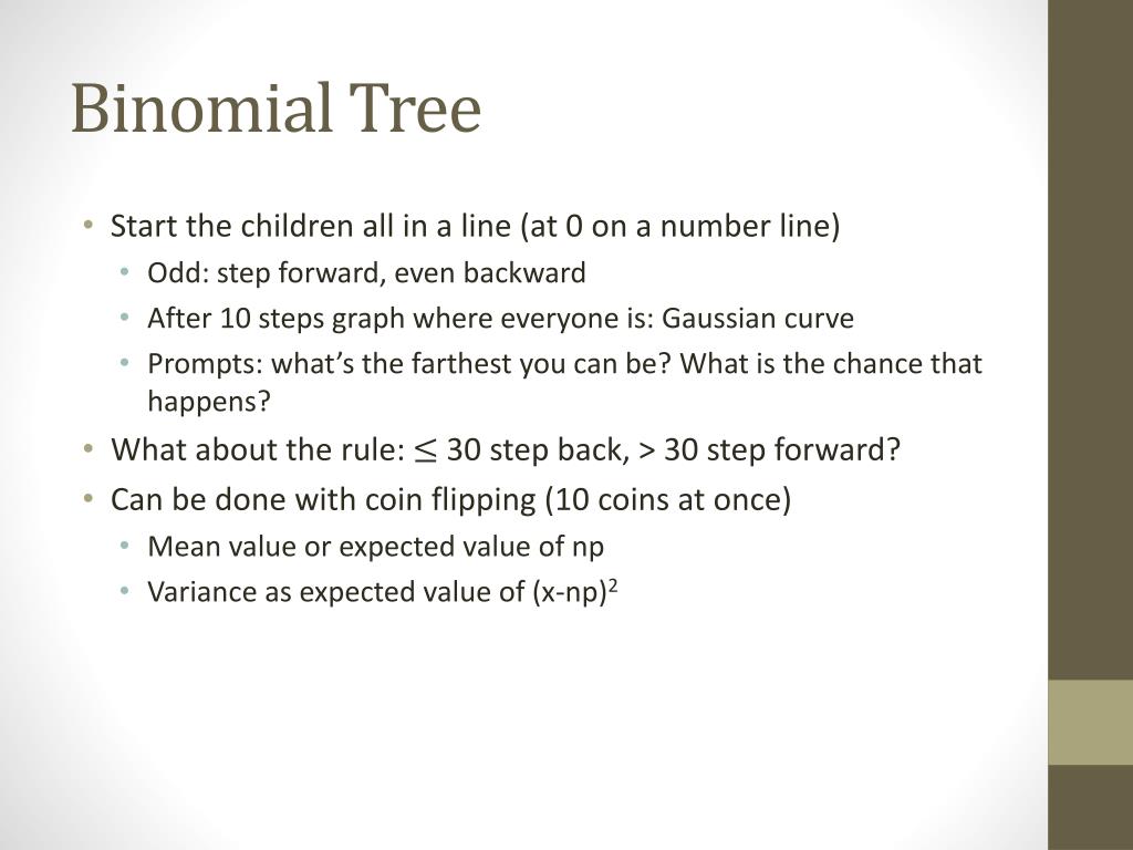 Binomial Tree • Start the children all in a line (at 0 on a number line) • Odd: step forward, even backward • After 10 steps graph where everyone is: Gaussian curve • Prompts: what’s the farthest you can be? What is the chance that happens? • What about the rule: 30 step back, > 30 step forward? • Can be done with coin flipping (10 coins at once) • Mean value or expected value of np • Variance as expected value of (x-np)2