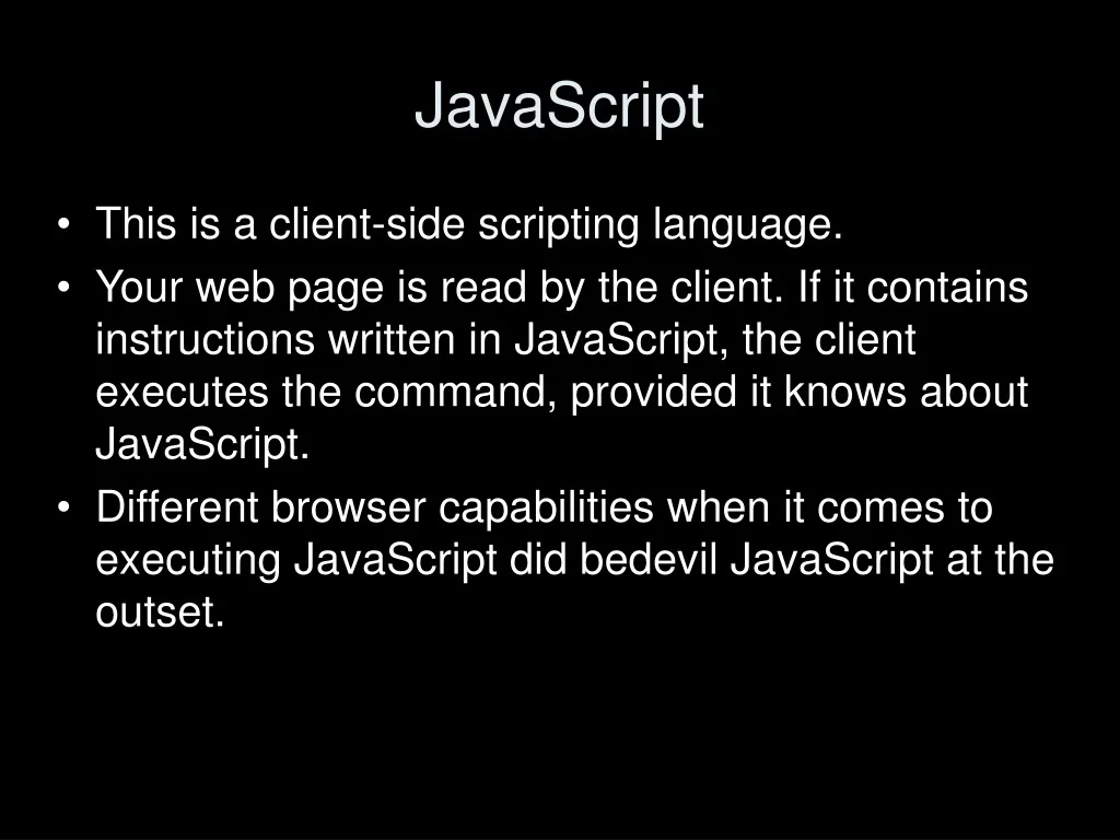 JavaScript • This is a client-side scripting language. • Your web page is read by the client. If it contains instructions written in JavaScript, the client executes the command, provided it knows about JavaScript. • Different browser capabilities when it comes to executing JavaScript did bedevil JavaScript at the outset.
