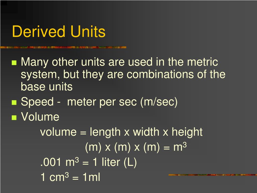 Derived Units • Many other units are used in the metric system, but they are combinations of the base units • Speed - meter per sec (m/sec) • Volume volume = length x width x height (m) x (m) x (m) = m3 .001 m3 = 1 liter (L) 1 cm3 = 1ml