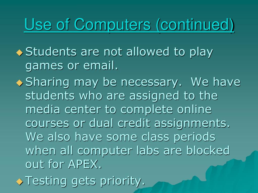 Use of Computers (continued) Students are not allowed to play games or email. Sharing may be necessary. We have students who are assigned to the media center to complete online courses or dual credit assignments. We also have some class periods when all computer labs are blocked out for APEX. Testing gets priority.