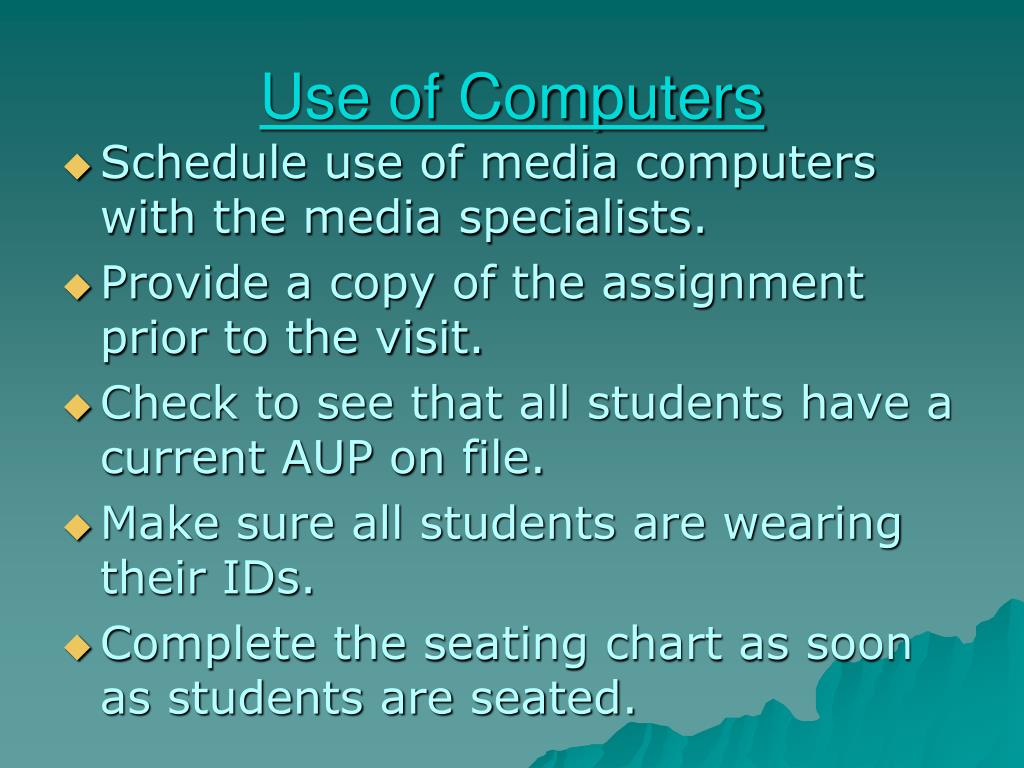 Use of Computers Schedule use of media computers with the media specialists. Provide a copy of the assignment prior to the visit. Check to see that all students have a current AUP on file. Make sure all students are wearing their IDs. Complete the seating chart as soon as students are seated.