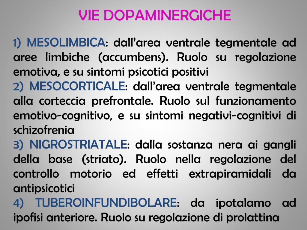 VIE DOPAMINERGICHE 1) MESOLIMBICA: dall’area ventrale tegmentale ad aree limbiche (accumbens). Ruolo su regolazione emotiva, e su sintomi psicotici positivi 2) MESOCORTICALE: dall’area ventrale tegmentale alla corteccia prefrontale. Ruolo sul funzionamento emotivo-cognitivo, e su sintomi negativi-cognitivi di schizofrenia 3) NIGROSTRIATALE: dalla sostanza nera ai gangli della base (striato). Ruolo nella regolazione del controllo motorio ed effetti extrapiramidali da antipsicotici 4) TUBEROINFUNDIBOLARE: da ipotalamo ad ipofisi anteriore. Ruolo su regolazione di prolattina