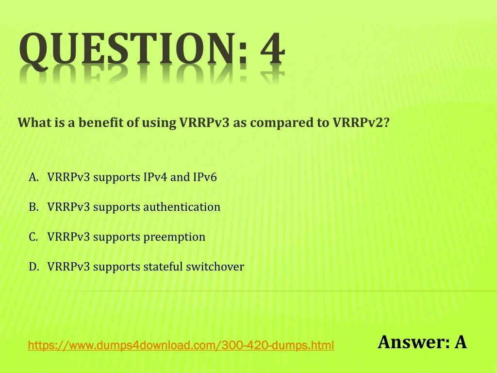 VRRPv3 supports IPv4 and IPv6 VRRPv3 supports authentication VRRPv3 supports preemption VRRPv3 supports stateful switchover What is a benefit of using VRRPv3 as compared to VRRPv2? Question: 4 Answer: A https://www.dumps4download.com/300-420-dumps.html