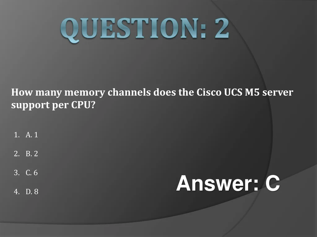 How many memory channels does the Cisco UCS M5 server support per CPU? Question: 2 A. 1 B. 2 C. 6 D. 8 Answer: C