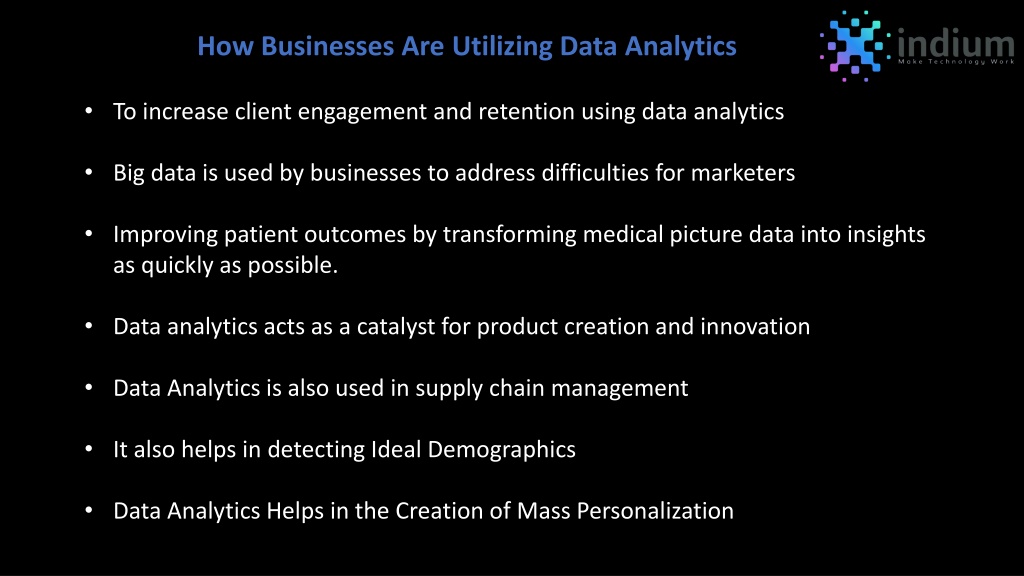 Thank You For more Visit: https://www.indiumsoftware.com/data-analytics/ Inquiries: info@indiumsoftware.com Toll-free: +1(888) 207 5969