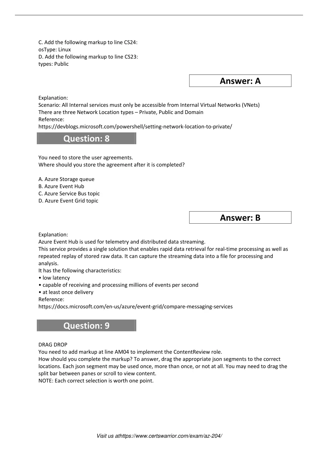 C. Add the following markup to line CS24: osType: Linux D. Add the following markup to line CS23: types: Public Answer: A Explanation: Scenario: All Internal services must only be accessible from Internal Virtual Networks (VNets) There are three Network Location types – Private, Public and Domain Reference: https://devblogs.microsoft.com/powershell/setting-network-location-to-private/ Question: 8 You need to store the user agreements. Where should you store the agreement after it is completed? A. Azure Storage queue B. Azure Event Hub C. Azure Service Bus topic D. Azure Event Grid topic Answer: B Explanation: Azure Event Hub is used for telemetry and distributed data streaming. This service provides a single solution that enables rapid data retrieval for real-time processing as well as repeated replay of stored raw data. It can capture the streaming data into a file for processing and analysis. It has the following characteristics: • low latency • capable of receiving and processing millions of events per second • at least once delivery Reference: https://docs.microsoft.com/en-us/azure/event-grid/compare-messaging-services Question: 9 DRAG DROP You need to add markup at line AM04 to implement the ContentReview role. How should you complete the markup? To answer, drag the appropriate json segments to the correct locations. Each json segment may be used once, more than once, or not at all. You may need to drag the split bar between panes or scroll to view content. NOTE: Each correct selection is worth one point. Visit us athttps://www.certswarrior.com/exam/az-204/