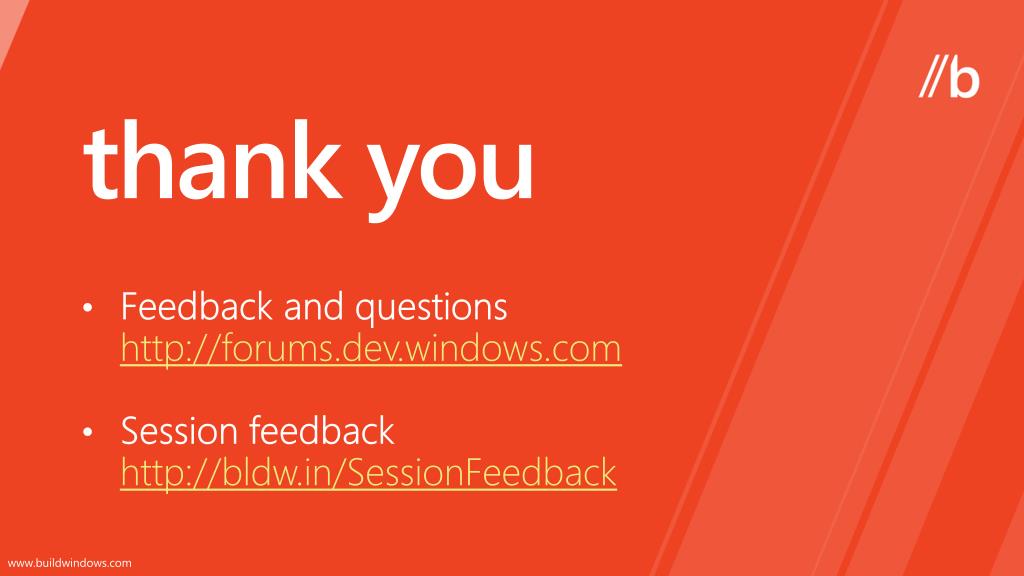 thank you Feedback and questions http://forums.dev.windows.com Session feedbackhttp://bldw.in/SessionFeedback
