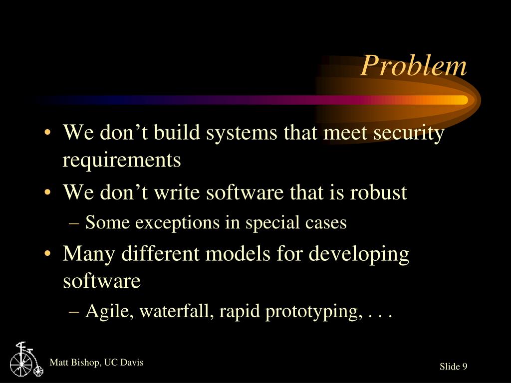 Problem • We don’t build systems that meet security requirements • We don’t write software that is robust • Some exceptions in special cases • Many different models for developing software • Agile, waterfall, rapid prototyping, . . .
